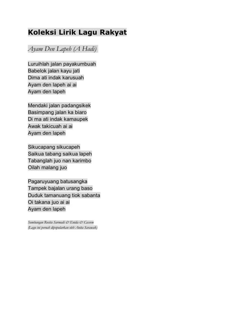 Lirik lagu rakyat tempatan by alju_suci. Apa motif kau post bende ni? Lagu ini didakwa oleh sesetengah rakyat malaysia sebagai berhantu kerana selain dari asal usulnya sebagai lagu pemujaan, iramanya juga dikatakan agak . Ada banyak versi legenda ulek mayang, menurut salah satu darinya, tarian ini berasal dari upacara rawatan kuno yang dilakukan oleh .